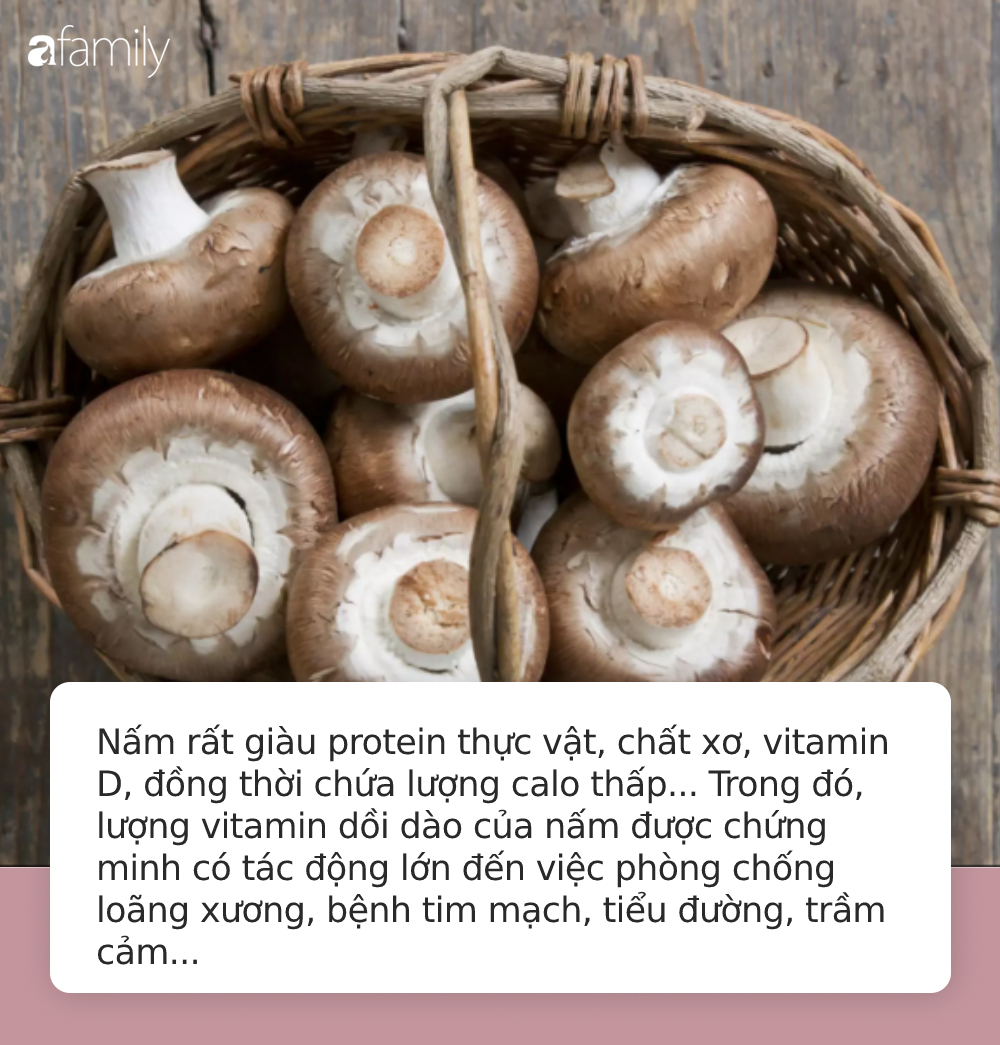 Nấm rất giàu protein thực vật, chất xơ, vitamin D, đồng thời chứa lượng calo thấp... Trong đó, lượng vitamin dồi dào của nấm được chứng minh có tác động lớn đến việc phòng chống loãng xương, bệnh tim mạch, tiểu đường, trầm cảm...