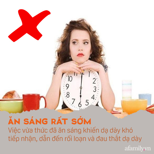 Nhiều người đã quen dậy sớm sẽ ăn sáng ngay sau khi thức dậy lúc 5 hoặc 6 giờ sáng. Chúng ta nghĩ rằng ăn sáng thật sớm sẽ khiến cơ thể hấp thụ dinh dưỡng tốt hơn. Việc vừa thức đã ăn sáng khiến dạ dày khó tiếp nhận, dẫn đến rối loạn, đau thắt dạ dày. Tình trạng này kéo dài sẽ là mầm mống gây ung thư dạ dày.