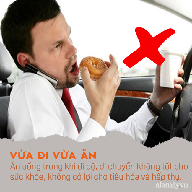 Ăn uống trong khi đi không tốt cho sức khỏe đường tiêu hóa, và không có lợi cho tiêu hóa và hấp thụ. Nếu bạn chọn thức ăn đường phố cho bữa sáng, bạn nên chú ý đến vệ sinh, tốt nhất là nên mua ăn tại nhà. Cố gắng không ăn sáng trên đường đi làm, điều này ảnh hưởng trực tiếp tới sức khỏe của bạn.