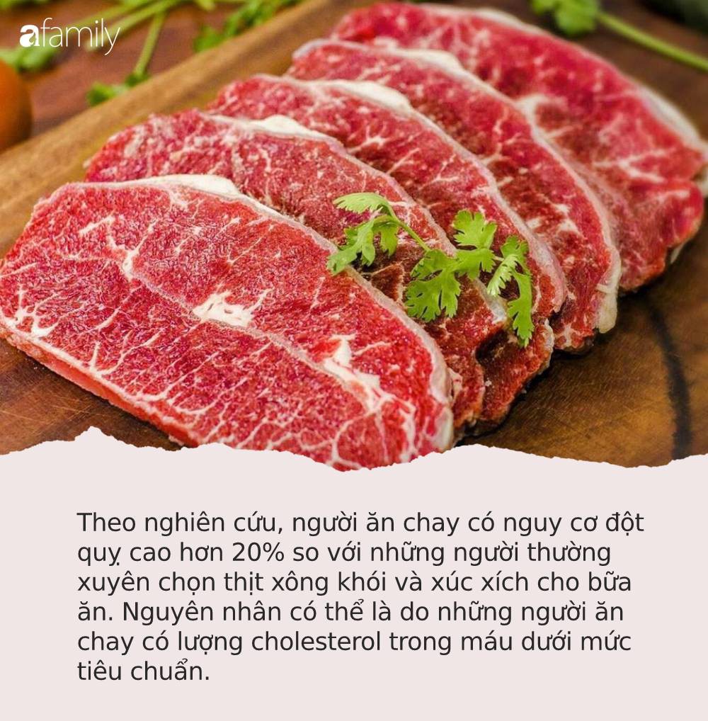 Tuy nhiên, một nghiên cứu chuyên đề của Đại học Oxford, vừa được công bố trên Tạp chí Y học Anh - BMJ vào đầu tháng 9/2019 đã làm chững lại trào lưu ăn theo chế độ dựa trên thực vật đang lan truyền với tốc độ nhanh chóng. Công trình nghiên cứu quy mô lớn bao gồm gần 50.000 người Anh được theo dõi sức khỏe nghiêm túc trong vòng 18 năm. Theo nghiên cứu, người ăn chay có nguy cơ đột quỵ cao hơn 20% so với những người thường xuyên chọn thịt xông khói và xúc xích cho bữa ăn. Nguyên nhân có thể là do những người ăn chay có lượng cholesterol trong máu dưới mức tiêu chuẩn.