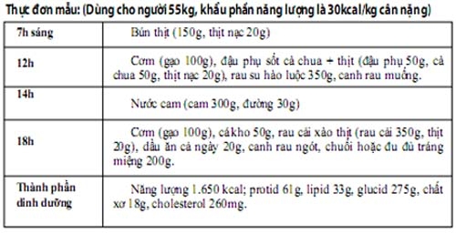 Đảm bảo thành phần dinh dưỡng hợp lý: Theo khuyến nghị của Viện Dinh dưỡng Quốc gia thì bữa ăn đủ dinh dưỡng hợp lý là khẩu phần năng lượng từ chất bột (đường) chiếm 50-60%; chất đạm (protid) chiếm10-20%; chất béo (lipid) do lipid đạt từ 20% tổng số năng lượng khẩu phần.