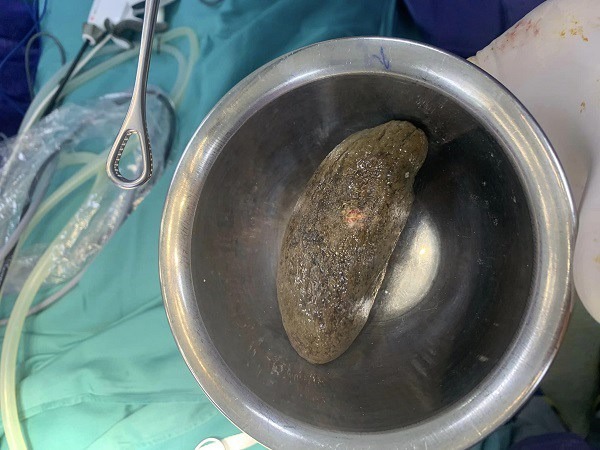 Ngay sau đó, các bác sĩ đã nội soi dạ dày để gắp thức ăn ra ngay tại phòng nội soi nhưng không thành công. Bệnh nhân tiếp tục được chuyển lên phòng mổ, tiến hành nội soi dạ dày, dùng máy laser để phá nhỏ bã thức ăn nhưng cũng không thể xuyên phá được do khối bã thức ăn quá rắn chắc.