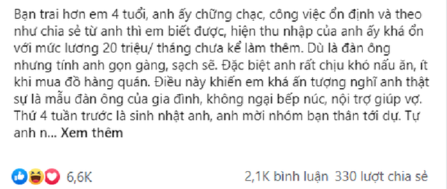 "Bạn trai hơn em 4 tuổi, anh ấy chững chạc, công việc ổn định và theo như chia sẻ từ anh thì em biết được, hiện thu nhập của anh ấy khá ổn với mức lương 20 triệu/ tháng chưa kể làm thêm. Dù là đàn ông nhưng tính anh gọn gàng, sạch sẽ. Đặc biệt anh rất chịu khó nấu ăn, ít khi mua đồ hàng quán. Điều này khiến em khá ấn tượng nghĩ anh thật sự là mẫu đàn ông của gia đình, không ngại bếp núc, nội trợ giúp vợ.