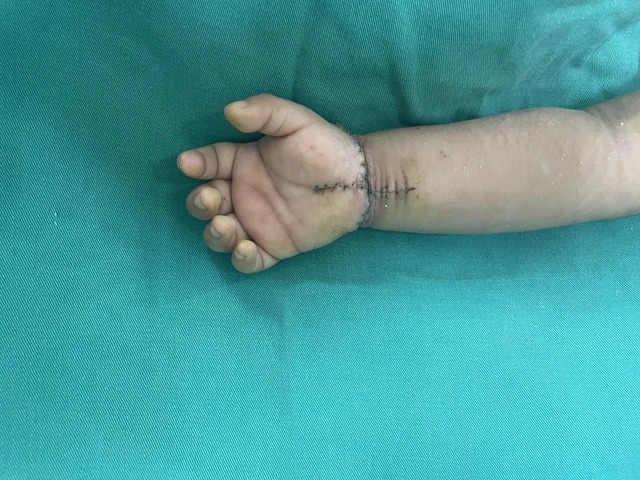 Sau mổ, bé được điều trị tích cực kết hợp phục hồi chức năng và thay băng chăm sóc vết thương. Hậu phẫu diễn biến thuận lợi, bàn tay được nuôi dưỡng tốt, đã có thể cử động nhẹ nhàng các ngón tay và cần tiếp tục theo dõi và phục hồi chức năng.