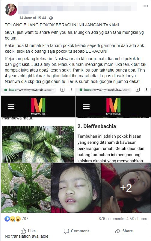 Theo chia sẻ thì do đang bận với đứa con nhỏ mà người mẹ này đã không để mắt đến cô con gái 4 tuổi của mình là Nashwa. Không lâu sau đó, Nashwa chạy đến bên mẹ và khóc nức nở, không nói được. Cô đã kiểm tra khắp người con nhưng không thấy có vết thương hoặc vết bầm tím nào. Ban đầu, con gái cô không muốn kể cho mẹ nghe chuyện gì xảy ra nhưng sau nhiều lần dỗ dành, Nashwa nói rằng cô bé đã cắn lá của một trong những cây xung quanh nhà.