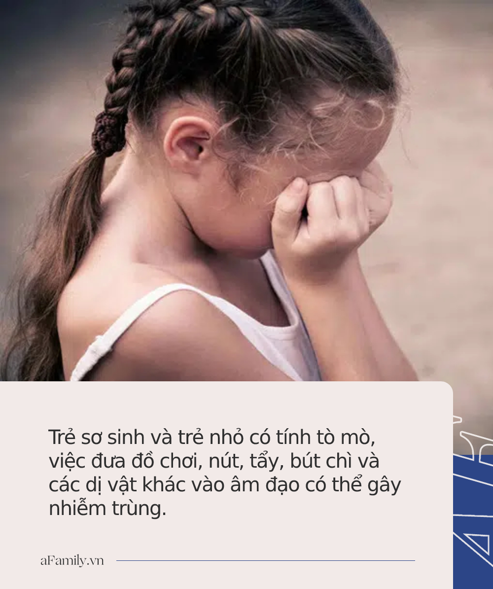 3. Đặt nhầm dị vật trong âm đạo: Trẻ sơ sinh và trẻ nhỏ có tính tò mò, việc đưa đồ chơi, nút, tẩy, bút chì và các dị vật khác vào âm đạo có thể gây nhiễm trùng.