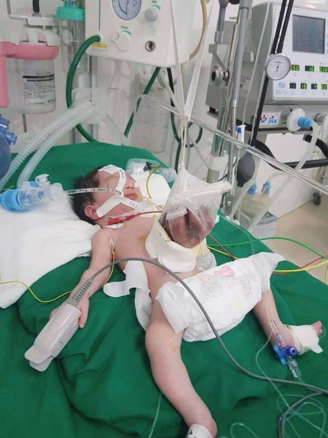 Những ngày cuối tháng 6, đầu tháng 7/2021, trong phòng đặc biệt vô khuẩn của khoa Hồi sức tích cực Ngoại khoa, em bé sơ sinh con sản phụ H. nằm lọt thỏm giữa những chiếc máy to tướng. Cơ thể bé bỏng của đứa trẻ phập phồng theo từng nhịp thở dồn dập, nặng nhọc đón nhận luồng ôxy được cung cấp từ chiếc máy thở.