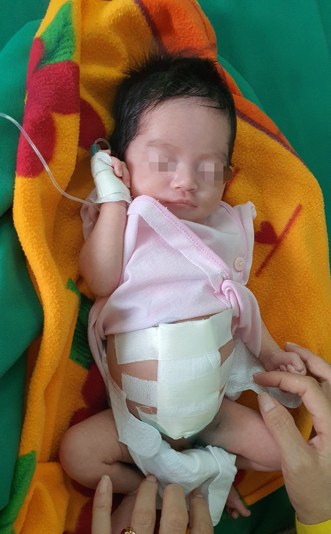Ngay khi nhập viện, các bác sĩ Bệnh viện Sản nhi Nghệ An đã siêu âm, phát hiện sự bất thường của thai nhi nên tổ chức hội chẩn khẩn liên khoa Sản, Ngoại, Hồi sức Ngoại, Gây mê để đi đến chỉ định mổ cấp cứu lấy thai. Ca mổ đẻ tiến hành ngay sau đó. Sản phụ Lô Thị H. sinh non 36 tuần tuổi, bé nhẹ cân 2kg; thành bụng bé có lỗ khuyết khiến cho toàn bộ đường ruột lòi ra ngoài...