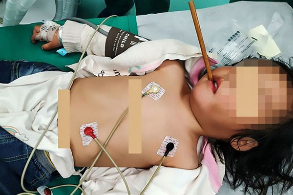 Các bác sĩ cho biết đầu que têm trầu nhọn nên vết thương rất sâu, gần tim, khiến bệnh nhân mất máu nhiều, suy hô hấp, máu tràn vào màng phổi, có thể tử vong bất cứ lúc nào. Vì vậy, trên đường di chuyển lên tuyến trên, bệnh nhi vừa được hồi sức vừa phải truyền máu.