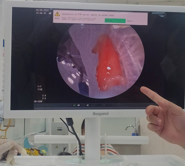 Khai thác từ gia đình, trẻ không có tiền sử bệnh lý, sau khi loại trừ các trường hợp có thể xảy ra, các Bác sỹ khoa Hồi sức tích cực – chống độc của bệnh viện lập tức nghĩ tới dị vật đường thở. Trẻ được chỉ định chụp CT lồng ngực. Hình ảnh chụp cho thấy trẻ bị tắc phế quản gốc bên phải. Ngay lập tức trẻ được đặt ống nội khí quản lại và tiến hành nội soi phế quản ngay tại giường, gắp ra được dị vật có kích thước 0.3*1cm, nghi giống miếng thịt tôm. Hiện tại thông khí đã ổn, trẻ được rút máy và có thể tự thở.