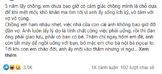 Câu chuyện như sau: "5 năm lấy chồng, em chưa bao giờ có cảm giác chồng mình là chỗ dựa để khi mệt mỏi, khó khăn mà tìm tới vì anh ấy sống ích kỷ, vô tâm với vợ vô cùng.