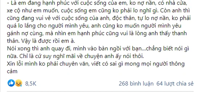 Mình mới dừng lại mấy giây, nhận ra nếu đó là chuyện thật thì sao anh ấy lại ngốc như vậy, sao lại không nói với mình để mình cùng anh ấy. Chúng mình ít ra cũng yêu nhau đến 7 năm rồi. Anh hiểu điều đó và lí giải lí do tại sao lại như thế: