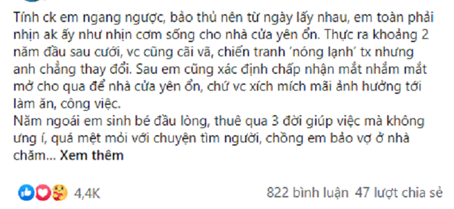 Câu chuyện như sau: "Tính chồng em ngang ngược, bảo thủ nên từ ngày lấy nhau, em toàn phải nhịn anh ấy như nhịn cơm sống cho nhà cửa yên ổn. Thực ra khoảng 2 năm đầu sau cưới, vợ chồng cũng cãi vã, chiến tranh 'nóng lạnh' thường xuyên nhưng anh chẳng thay đổi. Sau em cũng xác định chấp nhận mắt nhắm mắt mở cho qua để nhà cửa yên ổn, chứ vợ chồng xích mích mãi ảnh hưởng tới làm ăn, công việc.