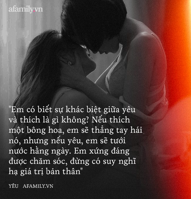 - Em có biết sự khác biệt giữa yêu và thích là gì không? Nếu thích một bông hoa, em sẽ thẳng tay hái nó, nhưng nếu yêu, em sẽ tưới nước hằng ngày. Em xứng đáng được chăm sóc, đừng có suy nghĩ hạ giá trị bản thân.