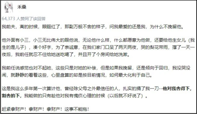 Một số người dùng mạng chê trách người vợ toan tính, lợi dụng tâm lý tội lỗi của chồng để giành hết tài sản mà đáng lẽ cô chỉ nhận được một nửa. Nhưng dẫu sao đó cũng là thỏa thuận giữa hai vợ chồng họ và người đàn ông cũng cần thực hiện nghĩa vụ với con chung.