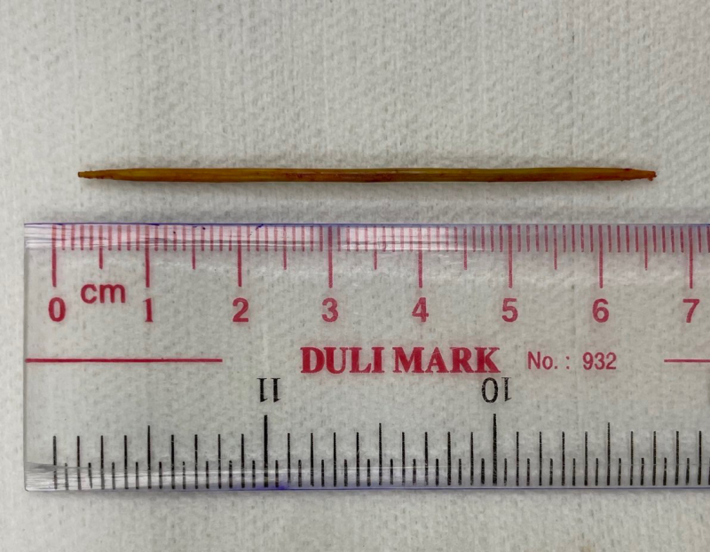 Được biết bệnh nhân có thói quen ngậm tăm sau khi ăn, thậm chí trong khi đi ngủ. Tình trạng đau bụng đã kéo dài 20 ngày, ăn uống kém. Bệnh nhân suy kiệt, nhiễm trùng toàn thân nặng.Bệnh viện đã cho hồi sức nội khoa tích cực, nâng đỡ thể trạng, hội chẩn các chuyên khoa thống nhất phẫu thuật.