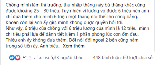 Như vậy, 6 triệu của chồng với 6 triệu lương của mình là 12 triệu, mình chi tiêu phải lựa để dành tiết kiệm 1 phần phòng lúc con ốm đau. Thiếu anh ấy không đưa thêm. Đối nội đối ngoại 2 bên cũng nằm trong số tiền ấy. Anh biếu xén nhà nội thế nào mình không được phép can dự với lý do đó là tiền riêng của anh. Đối với bên ngoại, anh chưa bao giờ chủ động biếu bố mẹ mình một đồng, kể cả lúc họ ốm".