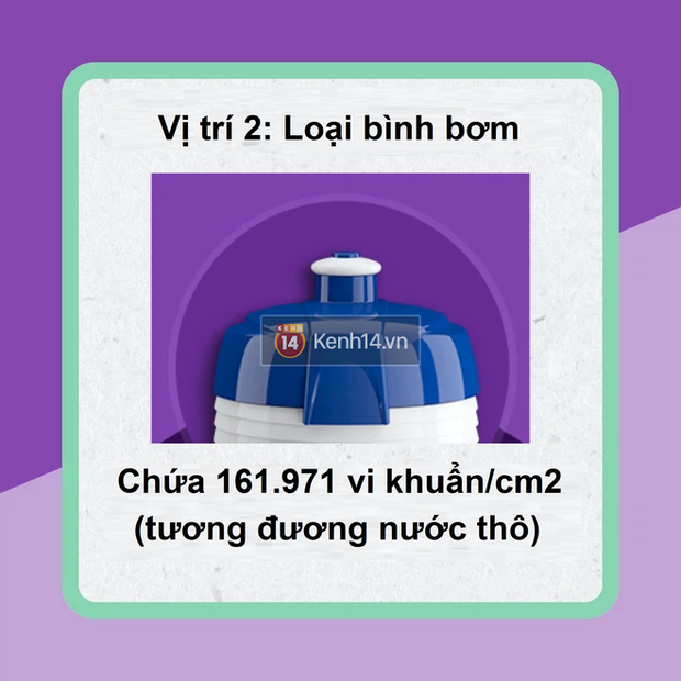 Theo nhóm thí nghiệm, số lượng vi khuẩn trên bình nước bơm (loại bóp) là gần 162.000 CFU/cm2. Mặc dù chúng không dễ bị nhiễm vi khuẩn như chai nước nắp trượt, nhưng những chai nước này lại chứa nhiều vi khuẩn như nước thô (chưa qua xử lý).