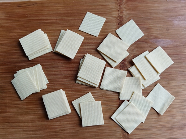 Vớt váng đậu ra, dùng khăn thấm khô bề mặt. Cắt váng đậu thành những miếng vuông nhỏ.