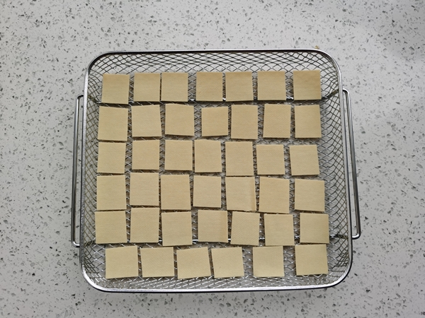 Xếp váng đậu vào vỉ chiên của nồi chiên không dầu hoặc lò nướng kiêm nồi chiên không dầu. Nhớ không xếp chồng lên nhau nhé!