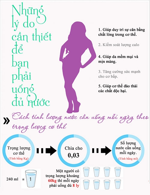 Dựa theo công thức tính toán, một người có trọng lượng khoảng 60 kg thì mỗi ngày phải uống 8 ly nước với thể tích mỗi ly là 240ml.