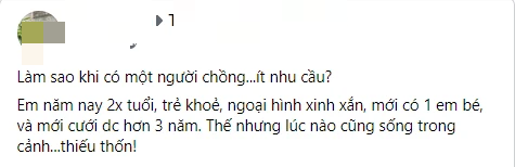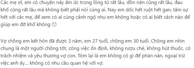 Kết cục, tôi thấy mặc cảm và xấu hổ vì trong mắt chồng, mình chẳng khác nào một "con nghiện". Còn chồng tôi, đương nhiên cũng không lạc quan hơn vì "đàn ông rõ trẻ khỏe mà chẳng có ham muốn". Vậy là từ quan hệ tình dục với tần suất thấp, chúng tôi gần như ăn chay hẳn vì không tìm được cách giải tỏa tâm lý cho nhau.