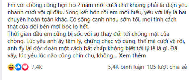 Câu chuyện được người vợ kể lại như sau: "Em với chồng cũng hẹn hò 2 năm mới cưới chứ không phải là yêu nhanh cưới vội gì đâu. Song kết hôn rồi em mới hiểu, yêu với lấy là hai chuyện hoàn toàn khác. Có sống cạnh nhau sớm tối, mọi tính cách thật của đôi bên mới bộc lộ hết.