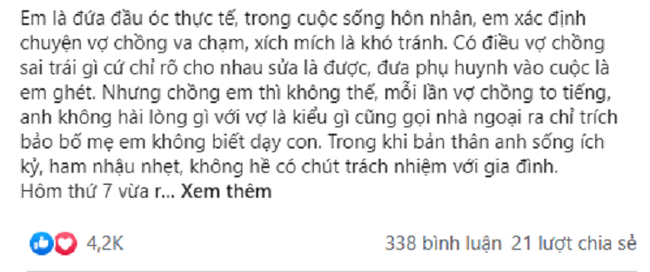 Vì quá thất vọng với cách hành xử thiếu trưởng thành của chồng, mới đây một người vợ trẻ đã vào mạng xã hội chia sẻ câu chuyện hôn nhân của mình như sau: "Em là đứa đầu óc thực tế, trong cuộc sống hôn nhân, em xác định chuyện vợ chồng va chạm, xích mích là khó tránh. Có điều vợ chồng sai trái gì cứ chỉ rõ cho nhau sửa là được, đưa phụ huynh vào cuộc là em ghét. Nhưng chồng em thì không thế, mỗi lần vợ chồng to tiếng, anh không hài lòng gì với vợ là kiểu gì cũng gọi nhà ngoại ra chỉ trích bảo bố mẹ em không biết dạy con. Trong khi bản thân anh sống ích kỷ, ham nhậu nhẹt, không hề có chút trách nhiệm với gia đình.
