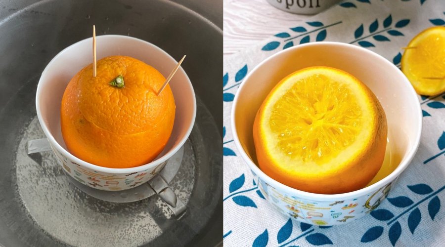 Bước 3: Cho cam vào 1 cái bát, đặt trong nồi hấp cách thủy trong 15 phút. Khi cam chín, mẹ bỏ vỏ, cho con ăn xơ tép bên trong và uống nước cam muối đó. Mùi cam hấp thơm ngon sẽ khiến bé rất thích thú lại còn có tác dụng vô cùng hiệu quả. Những triệu chứng ho đờm giảm hẳn, họng bé sẽ không còn đau rát.