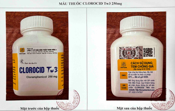 Thuốc Clorocid Tw3 250mg, SĐK: VD-25305-16, Số lô SX: 0321, NSX: 7/7/2021, HD: 7/7/2024, Nhà sản xuất: Công ty Cổ phần dược phẩm Trung ương 3, qui cách hộp 400 viên nén. Đây là thuốc kháng sinh. Trong khi đó, công ty này thông báo tới Cục Quản lý Dược từ 16/9/2019 đến 29/6/2022, công ty không tiến hành sản xuất lô thuốc nào đối với Clorocid Trung ương 3, SĐK: VD-25305-16.