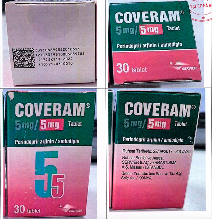 Cùng đó, cảnh báo với thuốc nghi ngờ giả là thuốc Diamicron MR 30mg, số lô: 695986, HSD: 9/2024, được chỉ định trong điều trị đái tháo đường type 2; thuốc Coveram 5mg/5mg, số lô: 2170310010, HSD: 11/2024, dùng điều trị tăng huyết áp, bệnh động mạch vành...