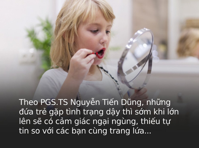 - Ngại ngùng, tự ti: Theo PGS.TS Nguyễn Tiến Dũng, những đứa trẻ gặp tình trạng dậy thì sớm khi lớn lên sẽ có cảm giác ngại ngùng, thiếu tự tin so với các bạn cùng trang lứa... Điều này sẽ gây ảnh hưởng lớn đến sự phát triển toàn diện của trẻ, khả năng hòa đồng, học tập và vui chơi...