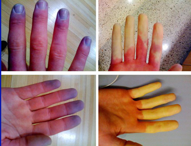 PGS.TS Hoàng Thị Lâm, BV ĐH Y Hà Nội cho biết trên Infonet, nhiều người thường có cảm giác tê bì, đau buốt đầu ngón tay, chân, khi tiếp xúc với nhiệt độ lạnh hoặc stress thì đổi màu đỏ, tím và rất đau. Nếu nhẹ thì da tại các vùng đó sẽ trở nên nhợt nhạt, hoặc đỏ sau đó chuyển sang màu tím, nặng hơn có thể hoại tử đen, nhiễm trùng…