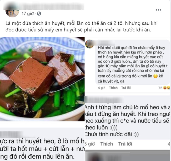 Chủ 1 tài khoản đăng tải lên nhóm trên facebook với nội dung: "Là một đứa thích ăn huyết, mỗi lần có thể ăn cả 2 tô. Nhưng sau khi đọc được tiểu sử mấy em huyết sẽ phải cân nhắc lại trước khi ăn". Đi kèm theo bài đăng là một loạt ảnh chụp bình luận khi nói về huyết lợn cũng như huyết vịt, huyết bò... khiến nhiều người rùng mình.