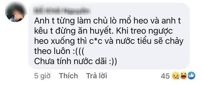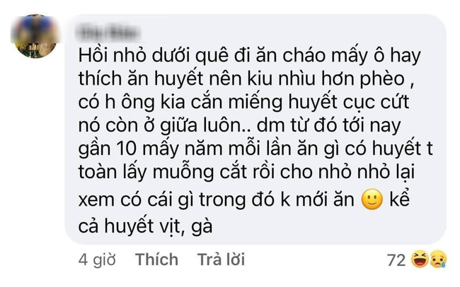 Thậm chí có bình luận còn kể trải nghiệm một lần đi ăn cháo lòng dưới quê, vì thích ăn huyết nên gọi thêm vào bát cháo. Ai ngờ khi đang cắn miếng huyết lợn béo ngậy thì phòi ra cả... phân ở giữa. Đây quả là một trải nghiệm hãi hùng cho những người đam mê ăn uống khoái khẩu. Sau vụ đó, người bình luận cũng cảnh giác cao độ với cả huyết gà, huyết vịt. Nếu muốn ăn sẽ phải soi kỹ từng miếng nhỏ rồi mới dám cho vào miệng.