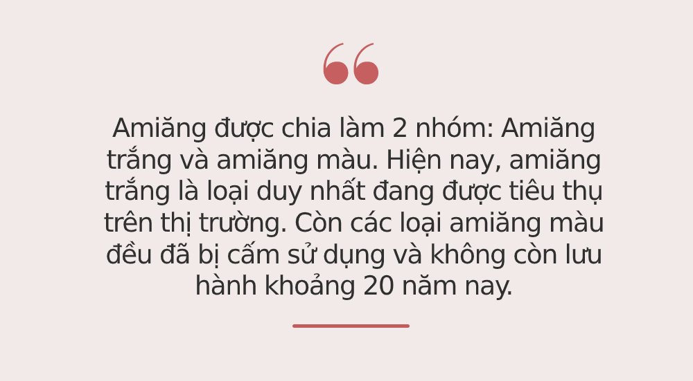 Amiăng được chia làm 2 nhóm: Amiăng trắng và amiăng màu. Hiện nay, amiăng trắng là loại duy nhất đang được tiêu thụ trên thị trường. Còn các loại amiăng màu đều đã bị cấm sử dụng và không còn lưu hành khoảng 20 năm nay.