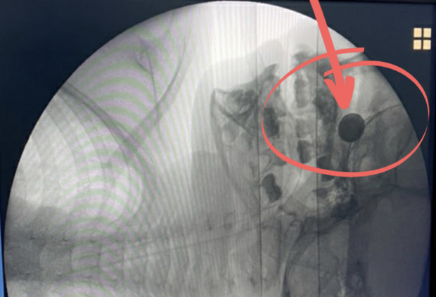 Tại đây, các bác sĩ đã thăm khám, chỉ định chụp X-quang cho bé H. Phát hiện dị vật hốc mũi, bác sĩ đã tiến hành lấy dị vật bằng phương pháp gây tê. Tuy nhiên cách này không thành công vì dị vật nằm rất sâu trong hốc mũi, mũi chảy máu nhiều và axit của pin đang gây phá hủy hốc mũi và thành mũi.
