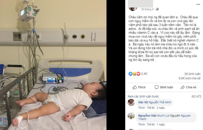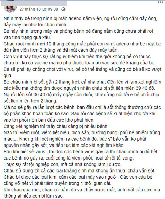 Chia sẻ trên facebook cá nhân, chủ tài khoản viết: "Cháu ruột mình mới 10 tháng cũng mắc phải con virus Adeno như bé này, bé đã nằm viện hơn 2 tháng và đã mất cách đây mấy tuần.