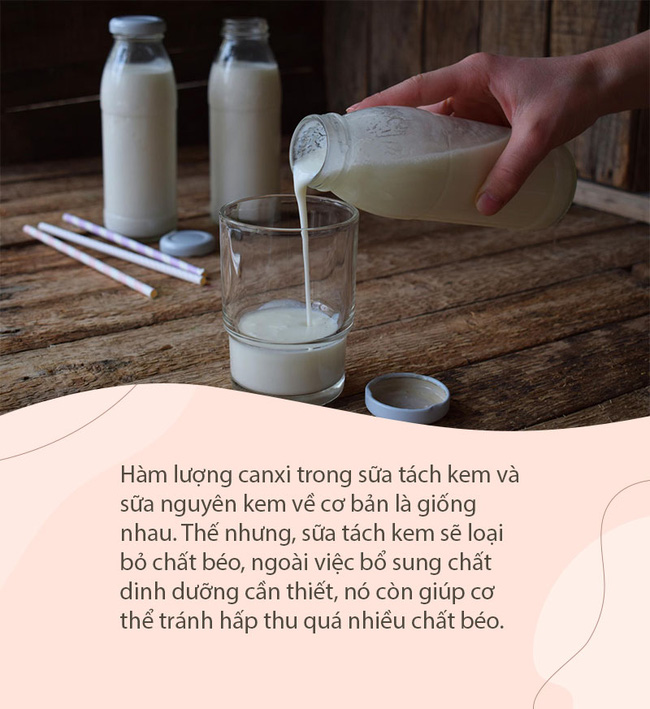 Hàm lượng canxi trong sữa tách kem và sữa nguyên kem về cơ bản là giống nhau. Thế nhưng, sữa tách kem sẽ loại bỏ chất béo, ngoài việc bổ sung chất dinh dưỡng cần thiết mà còn có thể tránh nạp vào cơ thể quá nhiều chất béo.