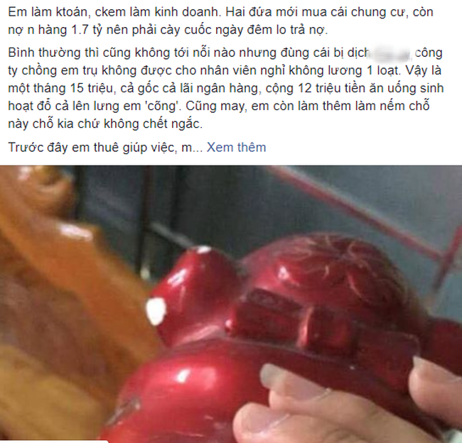 Bình thường thì cũng không tới nỗi nào nhưng đùng cái vào mùa dịch, công ty chồng em trụ không được cho nhân viên nghỉ không lương 1 loạt. Vậy là một tháng 15 triệu, cả gốc cả lãi ngân hàng, cộng 12 triệu tiền ăn uống sinh hoạt đổ cả lên lưng em 'cõng'. Cũng may, em còn làm thêm làm nếm chỗ này chỗ kia chứ không chết ngắc.