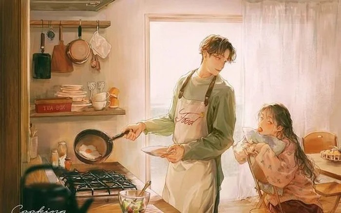 - Hai bố con xuống ăn cơm cơm.