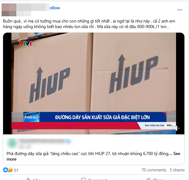 "Khổ thân, con đã còi cọc lại còn uống phải sữa giả. 2 thằng uống được 16 hộp sữa HIUP thì đừng mong không ảnh hưởng gì... Giờ mua cái gì cũng có thể giả được vậy", chị T.H chia sẻ.