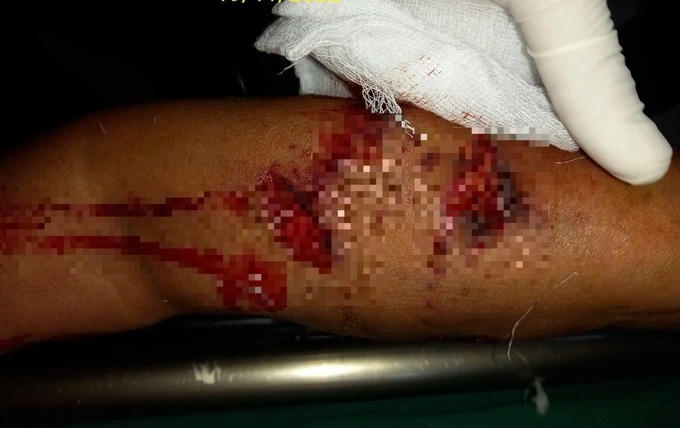 Các vết thương chằng chịt tại tay, vai, đùi, lưng, mông... trong đó nghiêm trọng nhất là vết thương tại cẳng tay trái kích thước khoảng 3x3cm, bờ nham nhở, lộ gân cơ, rỉ máu...
