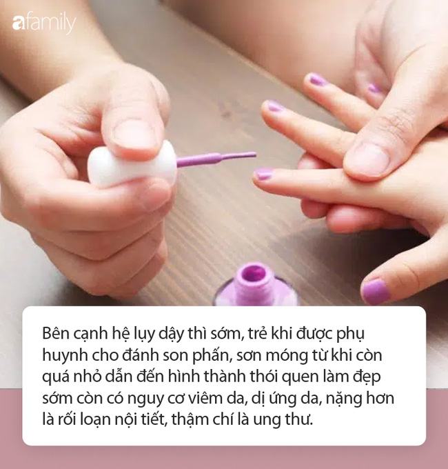 Bên cạnh hệ lụy dậy thì sớm, trẻ khi được phụ huynh cho đánh son phấn, sơn móng từ khi còn quá nhỏ dẫn đến hình thành thói quen làm đẹp sớm còn có nguy cơ viêm da, dị ứng da, nặng hơn là rối loạn nội tiết, thậm chí là ung thư. Không kể là hàng chất lượng tốt hay chất lượng kém, hàng không rõ nguồn gốc, xuất xứ, khi sử dụng lên làn da non nớt của trẻ đều có thể dẫn đến những hệ lụy này.