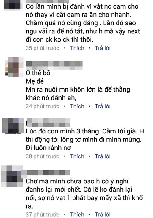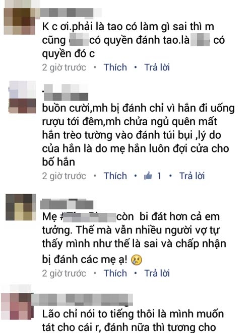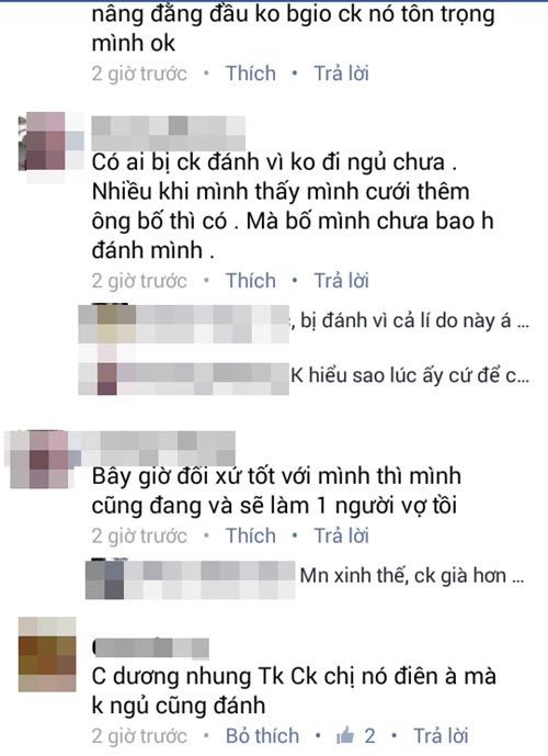Vô tình làm phật ý chồng bị đánh, đến cả việc chăm sóc chồng không đúng ý muốn cũng “ăn” đòn. “Có lần mình bị đánh vì vắt nước cam cho chồng thay vì cắt cam ra ăn cho nhanh. Chăm quá chồng cũng đánh. Lần đó sao ngu quá, để chồng tát…”, thành viên Phan Bảo S tâm sự.