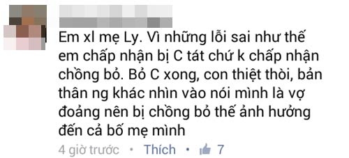 “Một cái tát không đánh đồng tất cả người đán ông là vũ phu, một cái tát ko mặc nhiên nói loại chồng đó không đáng làm chồng. Một cái tát nên nhìn lại bản thân mình vì sao lại bị như thế”, thành viên khác đồng tình.