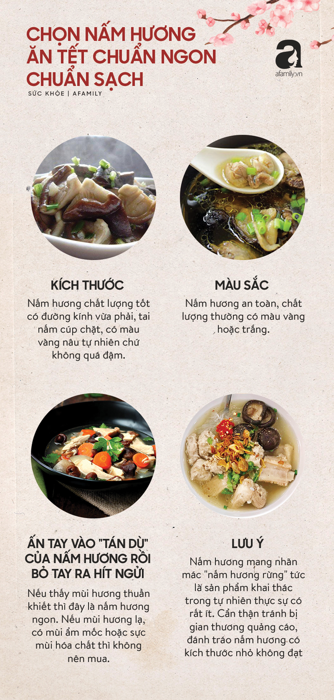 Nhỏ bé là thế nhưng nấm hương và mộc nhĩ thực sự là những món gia vị không thể không có trên mâm cơm Tết cổ truyền. Với những loại thực phẩm này, chị em tha hồ chế biến nem rán, canh măng, nấu canh xương, bóng bì lợn… - toàn những món ăn cổ truyền đậm đà hương vị đúng nghĩa.