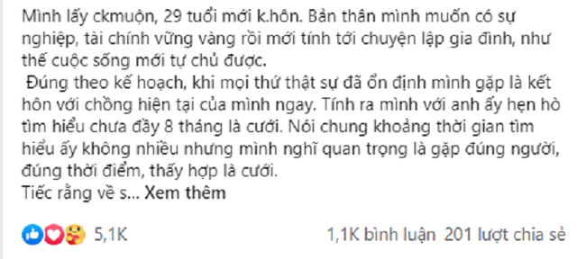 Chuyện nhà cô như sau: "Mình lấy chồng muộn, 29 tuổi mới kết hôn. Bản thân mình muốn có sự nghiệp, tài chính vững vàng rồi mới tính tới chuyện lập gia đình, như thế cuộc sống mới tự chủ được.