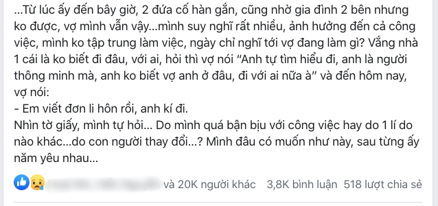 Mới đây, một người chồng đăng tải trên mạng xã hội câu chuyện ly hôn của mình. Bài viết nhanh chóng nhận về 20 nghìn like từ cư dân mạng cùng hàng loạt bình luận trái chiều. Chuyện như sau: