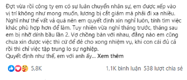 "Đợt vừa rồi công ty em có sự luân chuyển nhân sự, em được xếp vào vị trí không như mong muốn, lương bị cắt giảm mà phải đi xa nhiều. Nghĩ như thế vất vả quá nên em quyết định xin nghỉ luôn, tính tìm việc khác phù hợp hơn để làm. Tuy nhiên vừa nghỉ tháng trước, tháng sau em bị nhỡ dính bầu lần 2. Vợ chồng bàn với nhau, đằng nào em cũng chưa xin được việc thì cứ để đẻ cho xong nhiệm vụ, khi con cái đủ cả rồi thì chỉ việc tập trung lo sự nghiệp.